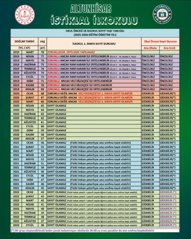2025 - 2026 Eğitim Öğretim Yılı 1. Sınıflar Kayıt Yaş Tablosu